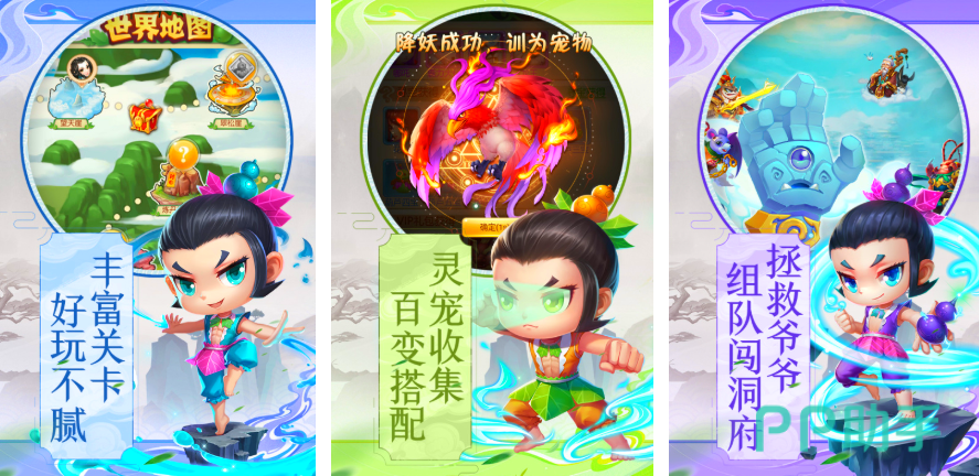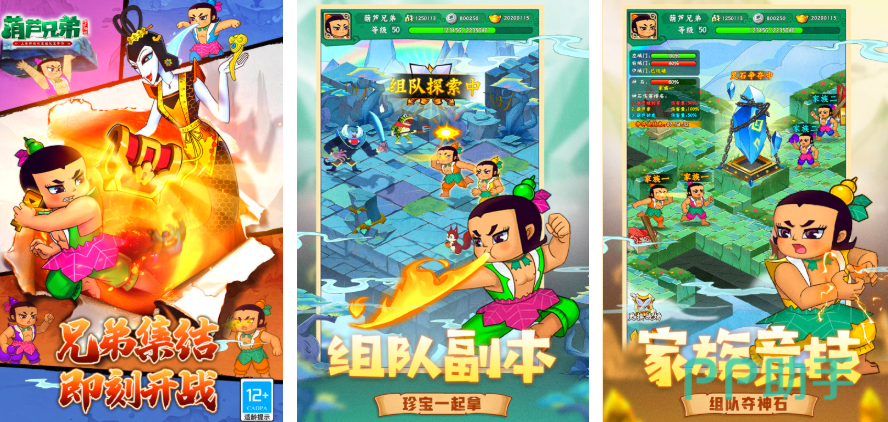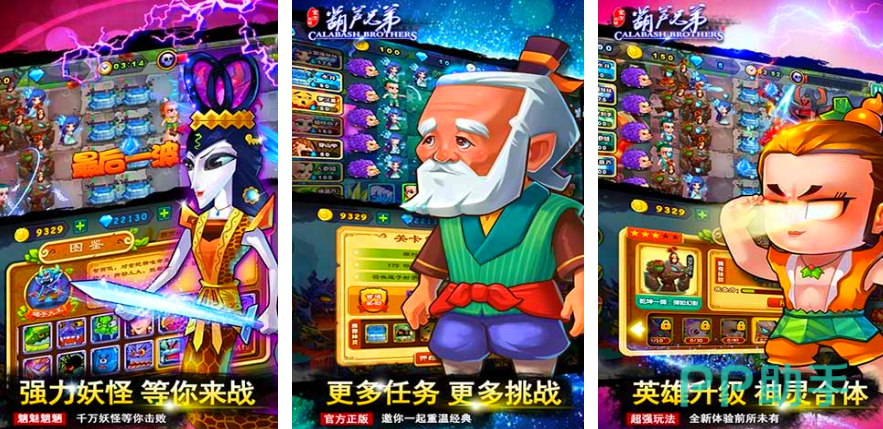 由上海美影授权的经典动画而改编的手游,不仅剧情丰富包含原版全部动画剧情,而且创新的加入了葫芦兄弟们的日常生活与妖怪的背景故事。玩家需要帮助葫芦娃们奔走世间一同斩妖除魔!游戏的玩法内容很丰富,包含角色培养、养成进化、关卡战斗、塔防模拟以及灵宠收集等大量内容,挑战难度也较为简单。玩家还能为葫芦娃们解锁各类强大技能,更是能合体为最终的葫芦小金刚!