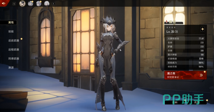 2技能”火药酬宾”,将远距离武器切换成另一种,此时只能使用技能和射击,而且不能移动,展开射击时,对面前的所有敌方打出伤害,射击持续时间内,自身每隔0.2秒获得1层攻速提高效果,最多叠加35层,使用该武器期间,自己受到伤害不会产生僵直,同时持续消耗神智,神智变为0时,或者再次使用时手绘武器。
