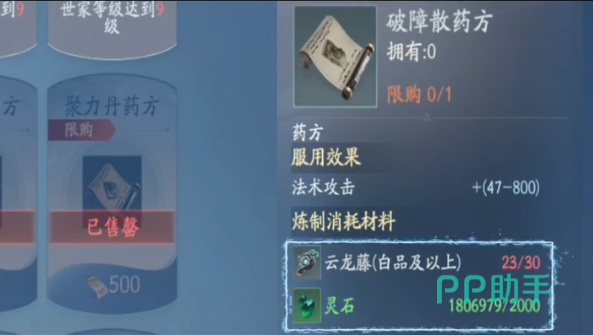 蕴养丹药的基本操作很简单,拿角色姜太虚来举例子,首先我们先去世家商店购买破障散药方,然后收集该丹药的炼制材料,破障散需要云龙藤和灵石来炼制,云龙藤种子可以直接在世家商店购买。