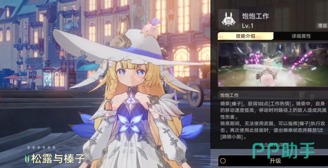 松露的2技能“饱饱够给你做”,乘骑小猪时获得100点的“工作热情”,在乘骑中能有移动速度加成效果,并对路径上的敌方目标造成风属性伤害。因为在乘骑状态下无法使用武器,只能通过小猪“榛子”来进行攻击,再次使用技能会退出乘骑装并释放1次“蹄蹄小跑”。