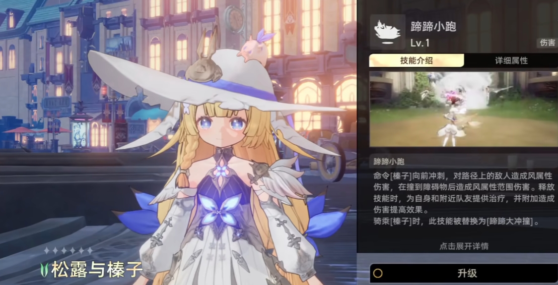 松露与榛子1技能“蹄蹄小跑”,可以命令小猪向前冲刺,对路径上的敌人造成风属性的伤害,在释放技能时还能对自身和附近的队员提供治疗,并附加伤害加成效果。如果释放技能是在乘骑状态时,技能升级为“蹄蹄大冲撞”。