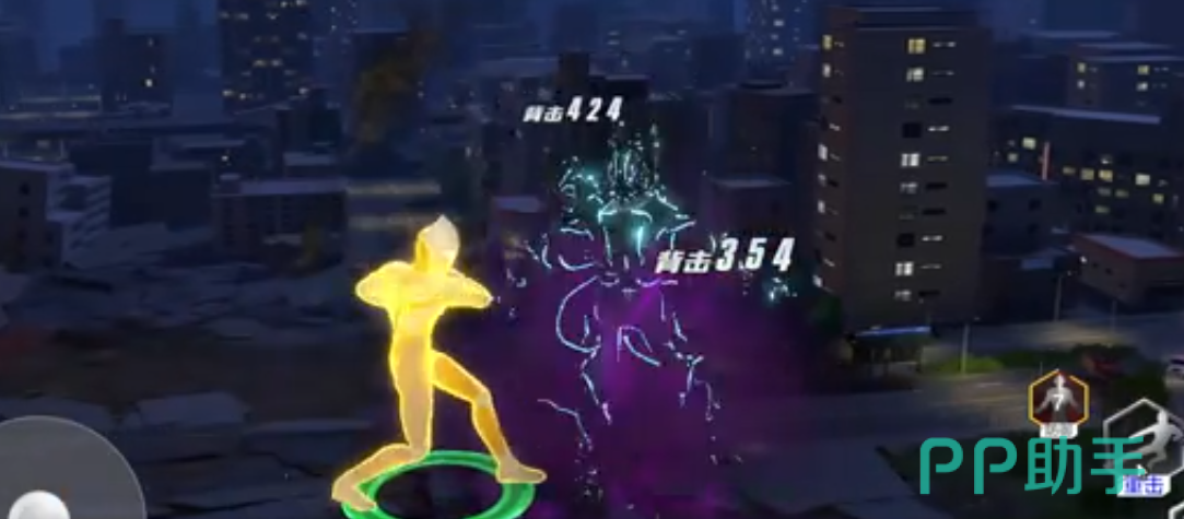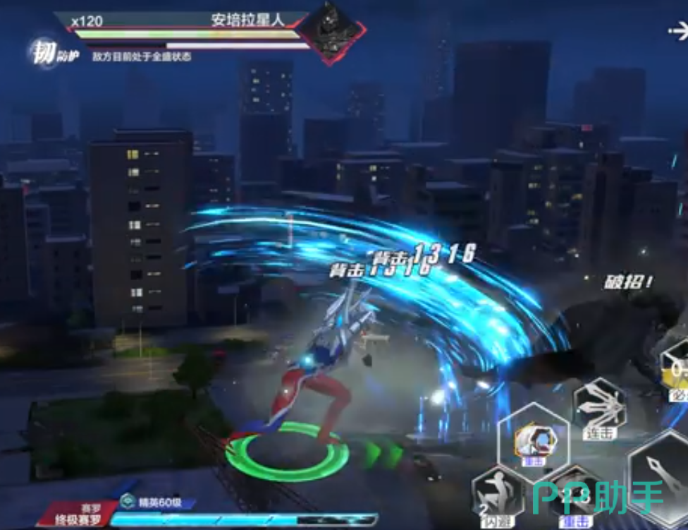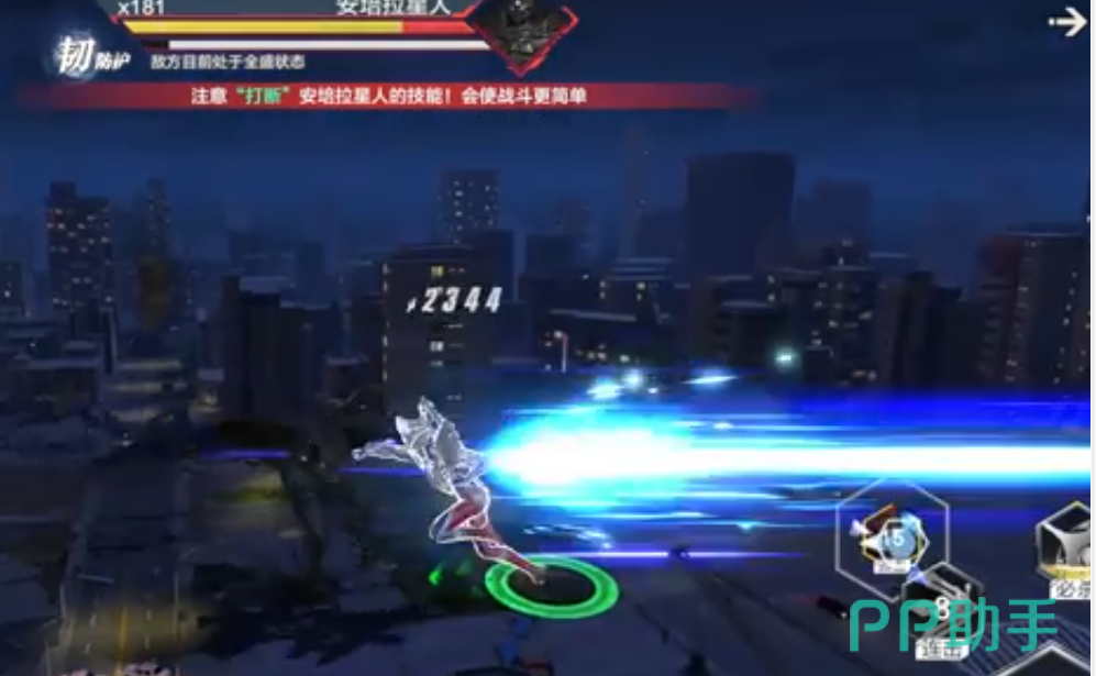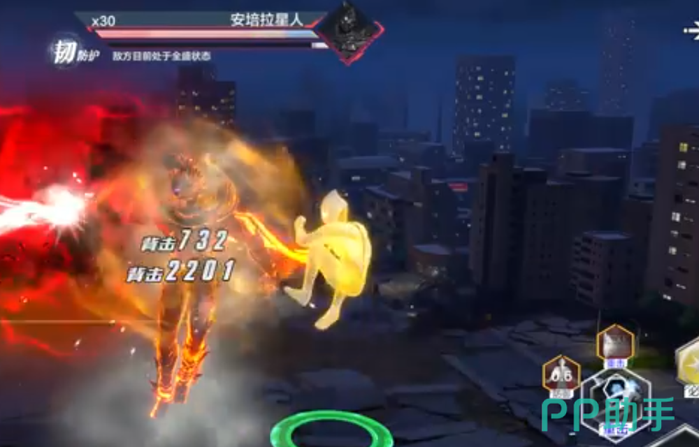 迪迦有一个比较特殊的地方就是它能打断首领的攻击,大家一定要善于使用,迪迦上场以后先使用闪耀爆裂,在继续闪耀冲锋,两个技能使用完厚接上几下平a,这一套直接能把安培拉星人的血量给打到80左右。之后使用闪耀毁灭、闪耀哉佩利敖光线、闪耀环形盾等技能攻击。