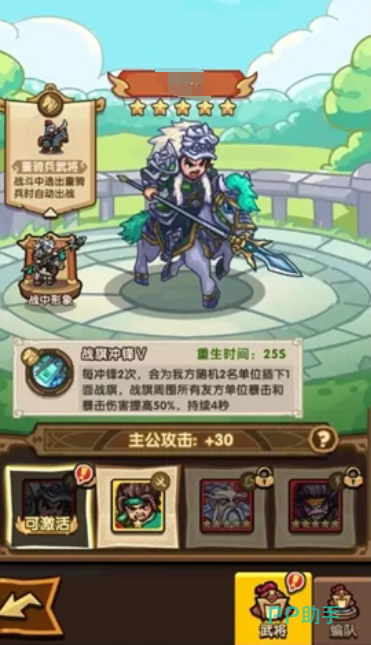 游戏里会有很多不同的角色,除了初始角色之外,玩家还可以通过完成任务收集碎片,获得更多的游戏成员,在这个过程中如果重复获得了相同的武将,那么就可以直接给武将提升一个星级,星级提升之后,整体的攻击力会变得更强,等提升到特定的阶段之后,技能也会得到强化,在培养到10级之后会免费获得一个民兵武将关平,借助这个武将能大幅度提升玩家的战斗能力。