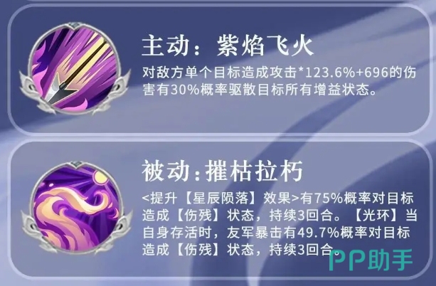 被动技能破甲如风同样强大,当夏侯渊触发暴击时,不仅会减少目标2点怒气,让敌人无法快速积攒怒气释放技能,还会对目标造成防御降低状态,持续3回合,并且有100%的概率对目标造成伤残状态,持续3回合,这一系列的效果叠加起来还是很厉害的,此外当夏侯渊攻击敏捷低于自身的目标时,暴击概率还会提升33%,主动技能紫焰飞火可以对敌方单个目标造成攻击123.6%+696的伤害,有30%的概率驱散目标所有增益状态。