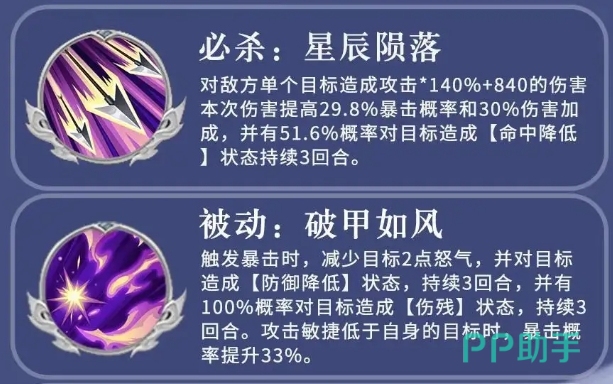 此外反击概率、命中、闪避以及状态抗性等属性也需要适当关注,但是优先级没有那么高,具体来看夏侯渊的技能,他的必杀技星辰陨落,可以对敌方单个目标造成攻击140%+840的高额伤害,这还不算完,本次伤害还会提高29.8%的暴击概率和30%的伤害加成,也就是说一旦触发暴击,那所造成的伤害将是极高的数值,而且还有51.6%的概率对目标造成命中降低状态,持续3回合,这让敌人在接下来的战斗中命中率大幅下降,难以对夏侯渊造成有效的反击。