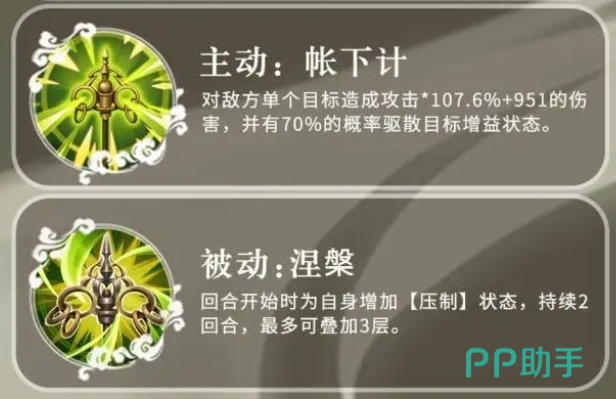主动技能帐下计会直击敌方单个目标,造成攻击107.6%+951的伤害,并且有70%的高概率驱散目标增益状态,另一个被动技能涅槃更是赋予了庞统强大的生存和持续战斗能力,在回合开始时,它能够为庞统自身增加压制状态,持续2回合,最多可叠加3层,由于庞统有足够的控制能力,他其实可以和陆逊、徐晃等角色达成控制流效果,不过这里因为流派的原因大家要是走的是水属性流派会更适合一些,所以队伍中的陆逊其实跟庞统的配合更重要,而徐晃则是当中的辅助角色。
