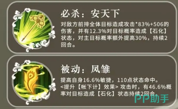 而且有12.3%的概率对目标造成石化状态,对主目标概率额外提高30%,持续2回合,这一技能在团战中非常实用,一旦释放,敌方前排就可能陷入石化状态,无法行动,被动技能凤雏能够提高自身16.6%的敏捷,让庞统在速度上更具优势,同时增加110点状态命中,并且这个被动技能还能提升帐下计的效果,让庞统在攻击时,有46.6%的概率对目标造成石化状态持续2回合。