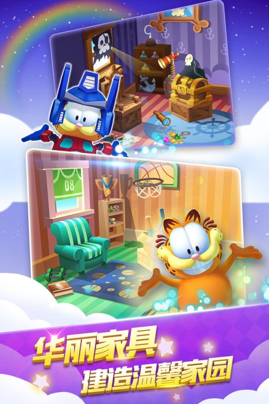 游戏画面深度复刻了原作动漫的经典韵味与细腻质感,色彩斑斓且充满活力。游戏中,各式各样的道具与炫酷技能将伴你左右,助你轻松跨越重重难关。而游戏的一大亮点,则是能与加菲猫携手,共同打造专属于你们的梦幻小镇。而作为加菲猫正版IP授权的诚意之作,海量开箱惊喜等你来发掘,丰厚宝藏等你赢取。