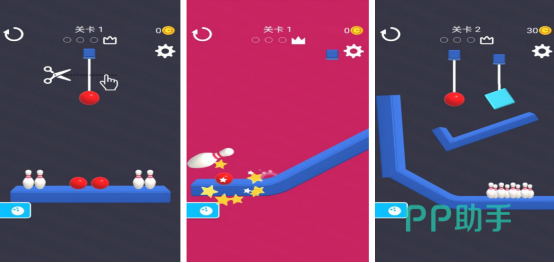在游戏创作时融入了多样化的元素,比如保龄球以及割绳子的元素,每一个保龄球都会被绳子牵住,而玩家要发挥出自己的策略头脑将绳子剪断,就可以让其中的保龄球快速飞出去,并且将所有的瓶子顺利击倒。虽然玩法特别简单,但是一定要按照独特的球体位置以及地形地貌做出巧妙的决策。