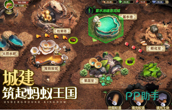 将蚂蚁进行拟人化,针对于蚂蚁的设计跟有着极高的真实度,以上帝视角为主题,为玩家带来沉浸式感受,可建立属于自己的地下王国,与盟友共同并肩作战,扩张个人领土。游戏具有极强的策略与智慧,与蚂蚁共同挑战,创建繁荣昌盛的蚁国,多元化玩法当中,玩家可能会遇到很多天敌,不过可以通过策略的方式成功获胜。