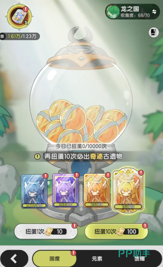部分遗物还可以在指定小区域消耗命运果实来探寻,该遗物对应的区域,大家可以点击未获得遗物来查看来源,也有一部分遗物可以在国度遗物池和元素遗物池获取,元素池的抽取道具比较难获取,建议抽取自己需求比较高,如果是贤者推荐暗,斗士推荐暗、火、风,骑士推荐水、光,术士推荐光、火、风。