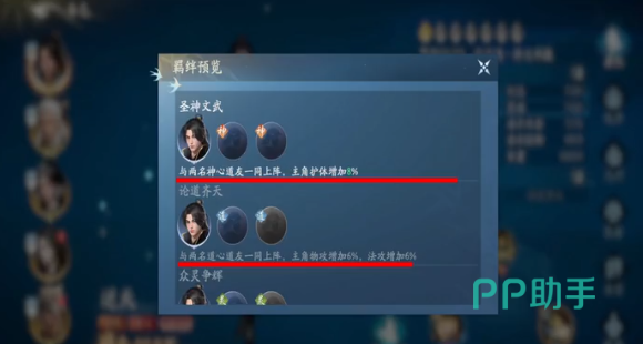 这一套可以说是当前测试版本中最为强势的,具体角色有主角、姜太虚、盖九幽、天玄圣女,段德和老疯子,这些成员能为主角凑出论道齐天、圣神文武羁绊,提升8%的护体,以及6%的物攻和法攻;
