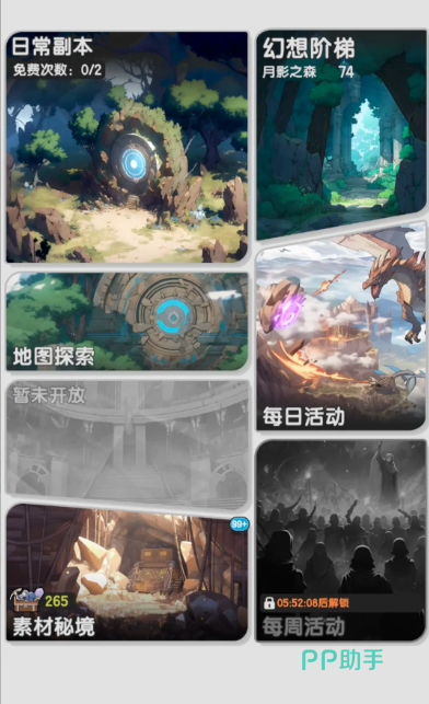 pve玩法除了开荒外,主要就是素材秘境、日常副本、每日活动的圣兽本、每周六会举行的混沌侵袭活动以及幻想阶梯副本,幻想阶梯副本是从森之国后每一个区域都会有的,简单来说就是爬塔,爬塔到一定位阶后可以一键速通。