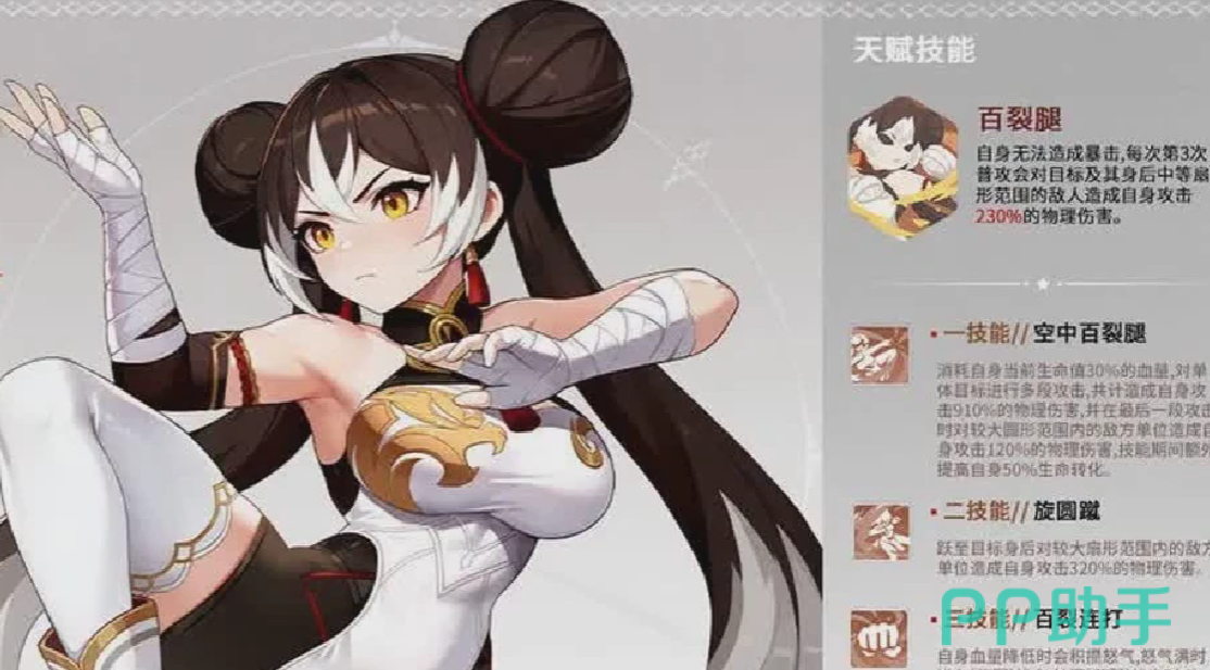 白虎的第二个技能,是她的“狂野”状态,当白虎怒气值达到满条时,则可以直接进入到狂野姿态,同时获取攻击力大幅提升的效果,此时白虎再次释放的普通攻击技能,则会成为“百裂腿”,整体的伤害非常之高,并且,白虎进入到狂野状态时,还可以获取免疫所有负面buff的效果,该技能在PVP战斗中,也能够发挥极大作用。