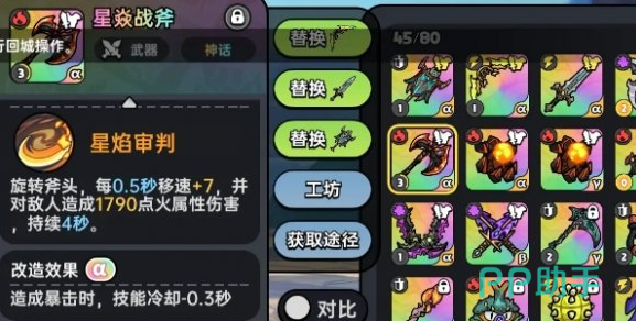 首先要提到的是星焱战斧。这款武器的高爆发能力使其在火属性武器中占据了一席之地。星焱战斧的技能效果是旋转斧头,每0.5秒造成高达1790点的火属性伤害,并持续4秒,同时还可提升角色的移动速度。改造方向上,推荐优先选择α-暴击火斧,因为暴击时技能冷却时间会大幅缩短,这使得玩家能够频繁释放技能,最大化输出。在获得途径上,玩家可以通过小镇深海活动宝箱或击杀小镇石头人后掉落的野猪来获取这把武器。星焱战斧的属性加成也不容忽视,提供的攻击力、暴击伤害和生命值提升,使其在战斗中极具竞争力。