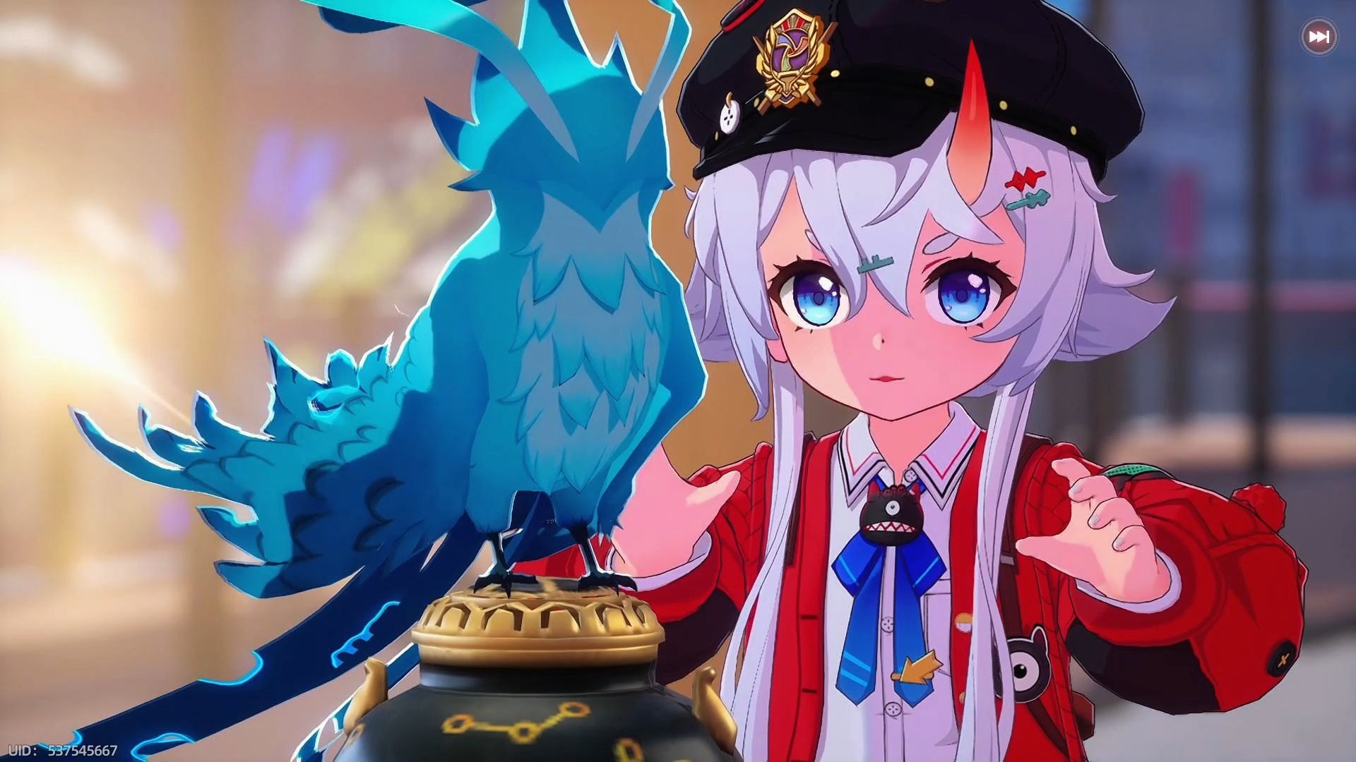 早雾这个角色在外形上的设计就已经非常的吸人眼球了,我们在进入游戏以后会遇到一个穿着一件红色的外套,有着一头白色的秀发,头顶还带着一顶黑色帽子的小女孩,小女孩最特别的地方是她的脑门处还长了一只小小的尖角,看起来可爱极了,这个小女孩就是我们的第一个伙伴们早雾,生活中的早雾是一个非常卫柔的少女,战斗时候的她就会立刻从温柔少女变成暴力妹子。