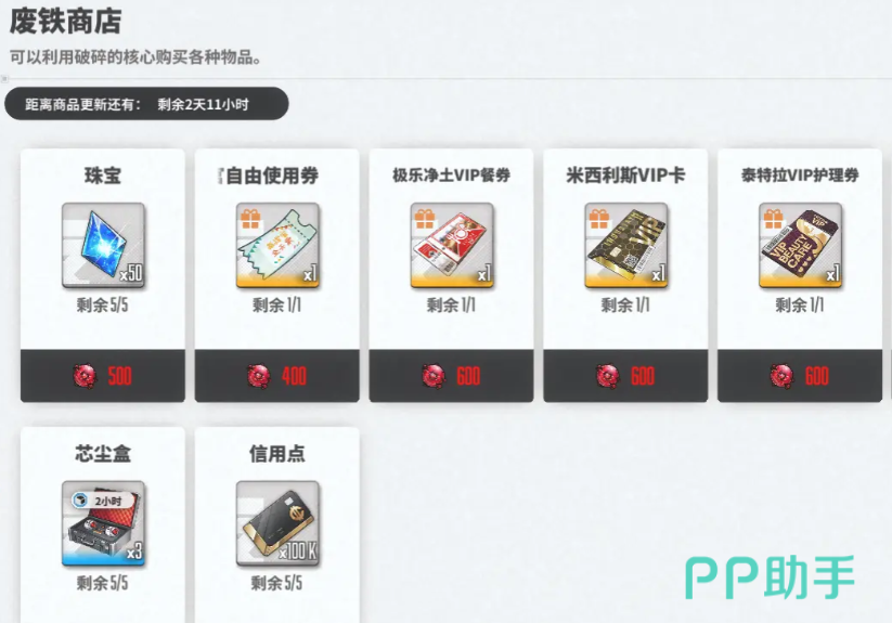 废铁商店内,比较推荐玩家进行兑换的道具,是信用点以及芯尘,在废铁商店之中,十个废铁可以换取一万信用点,玩家在每周刷新废铁商店时,都要将对应的购买商品全部清空。