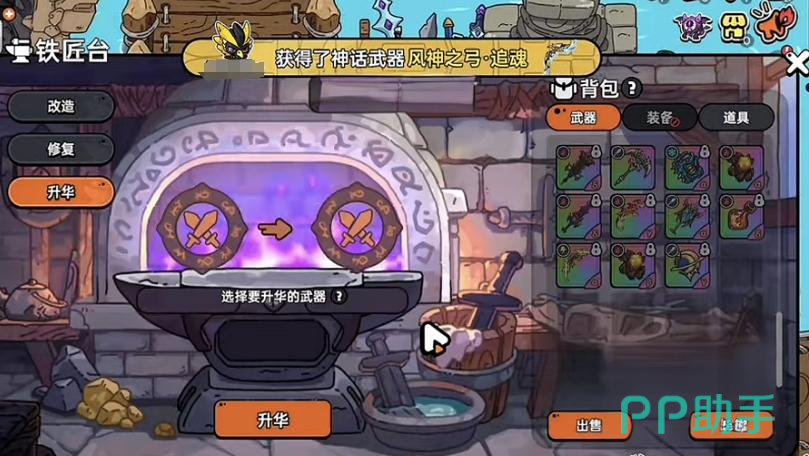 打开铁匠台从中找到武器升华的选项,进入武器升华的界面以后,我们可以看到左右各有一个空栏,左边的是武器栏右边是物品栏,把升华武器放到左边,元素石和武器图纸放到右边,在点以下升华按钮,静静等待几秒钟就完成升华了。