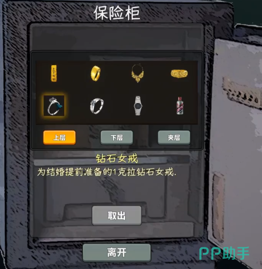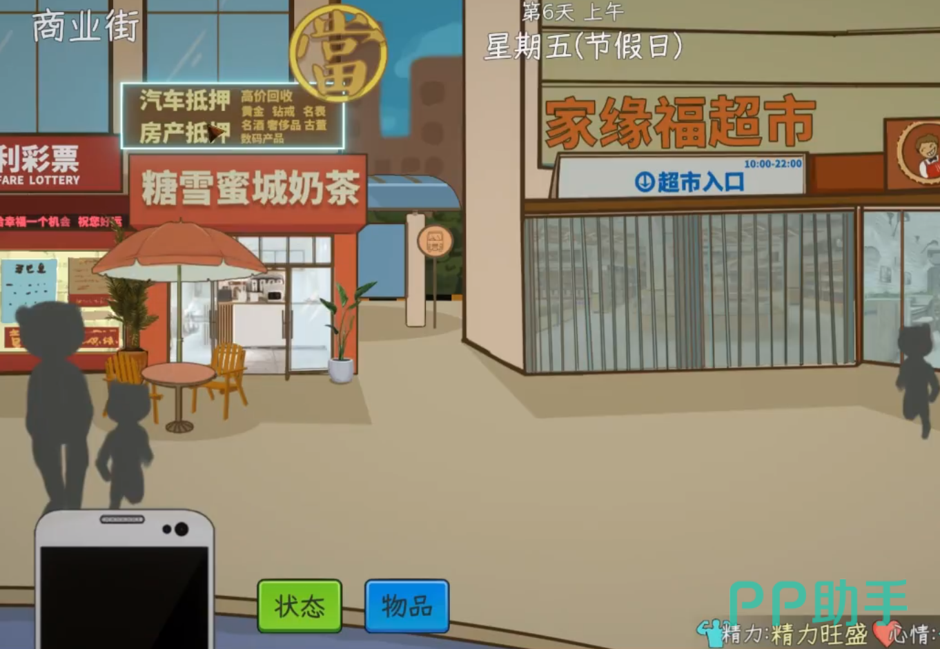 图上牌匾为“汽车抵押、房产抵押”的店铺即典当行,位于商业街奶茶店旁,大家可在此出售各类饰品、装备等道具,点击交互即可进入出售界面。可销售的物品可以打开保险柜(客厅大电视旁边),勾选可取出钻戒首饰、手表、红酒等。