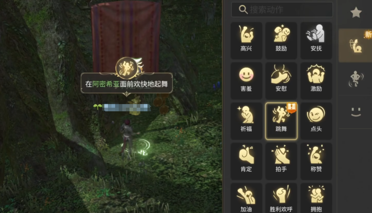 如果大家想要跳舞的话,那就可以直接点击跳舞的情感动作,就会朝着前方的人物跳舞。因为有一些任务要求大家在NPC面前做出一些情感动作,例如跳舞。这样就可以完成任务,并提升彼此的好感度。另外还有一些日常好用的动作,例如再见、大笑或者悲伤,都能在这找到。