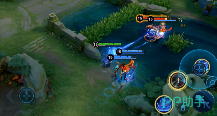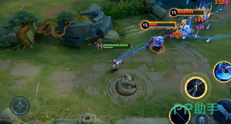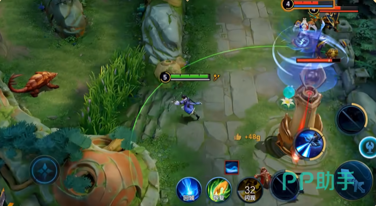 有点类似李白的大招,是没有CD的,对前方进行突进,使用军旗向前挥砍,技能结束之后会向后撤,他在挥舞军旗的时候,有三次机会能调整自己的位置,也就是圆点能用方向杆来操控,可选择敌方周围的任何位置,能利用摇杆调整自己大招结束后的位置。