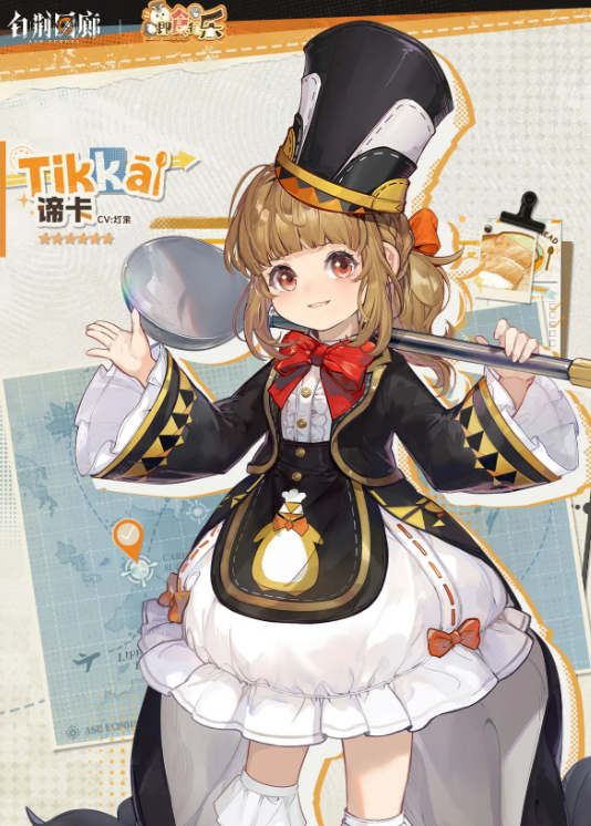 谛卡作为一位厨师,梦想是做出梦幻咖喱,为此她不仅收集了杜松子、青红椒油等不同香料,还在自己的工作台前悬挂了一张森罗地图,这张地图上全部都是和梦幻咖喱有一丝相似的各地美食,准备有机会去依次试吃。