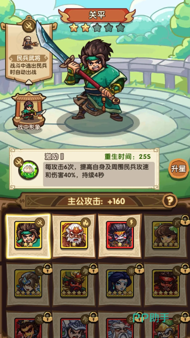 当大家解锁武将后可提升整体战力,即使不上阵也能提供加成,如初始武将关平能强化民兵。然后武将也可升星强化技能,军师系统则能优化兵种选择,减少随机性。所以大家可根据自身的需求点,去灵活选择培养不同的武将。