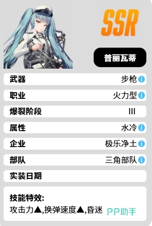 普丽瓦蒂的主动效果可以带来90%左右的伤害,然后让敌人陷入昏迷状态,持续3秒,这一技能在团战中的作用很大,它不仅能够对敌方全体造成大面积的伤害,削弱敌人的整体战斗力,还能通过昏迷效果打乱敌人的战斗节奏,而在配队方面,普丽瓦蒂的技能特点也提供了丰富的策略选择,由于她技能1加成攻击、换弹速度,并对最大装弹数有50.66%的Debuff,且等级增加只加攻击和换弹速度,不再增加该Debuff,所以在配队时需要充分考虑这一特性。
