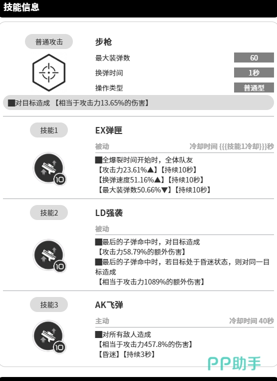普丽瓦蒂手持步枪进行普通攻击时,能够对目标造成相当于攻击力13.65%的伤害,她的被动技能更是为其强大助力不少,其中第一个被动技能,在全爆裂时间开启之际,全体队友都能感受到其带来的强大增益,队友的攻击力会瞬间提升10.53%,这一提升使得队友们在这段时间内能够对敌人造成更具威胁的伤害,同时换弹速度的提升幅度高达34.12%,这意味着队友们能够更加迅速地进行弹药补充,减少因换弹而可能导致的战斗中断风险。