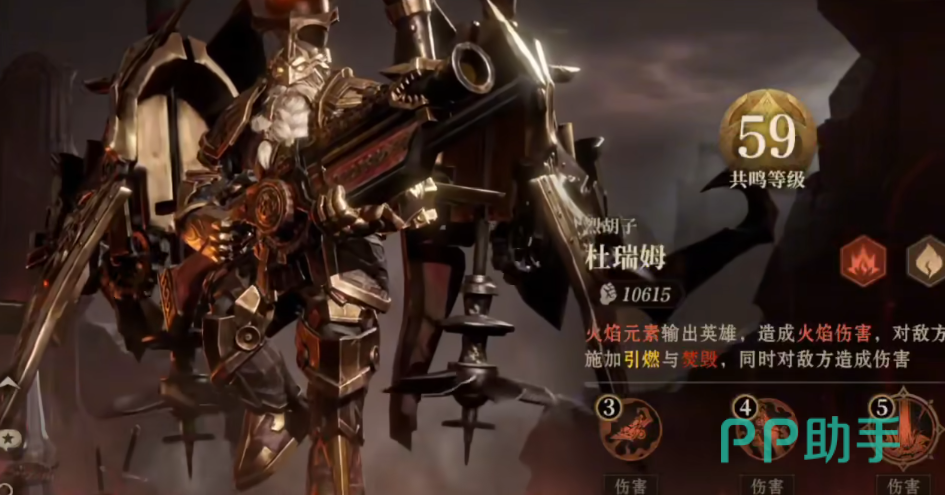 另一名强力辅助是烈胡子“杜瑞姆”。3技能对范围内目标造成3次火焰伤害,并根据敌人身上的燃烧层数,施加同等层数的“焚毁”状态。焚毁效果是使敌人所受伤害提升2%,意味着敌人身上燃烧越多,全队的输出越高。2技能提供范围火焰伤害与25%引燃,1技能则在敌人燃烧状态被移除时,以其为中心再度引爆一次火焰伤害,具有很强的收割与补伤能力。
