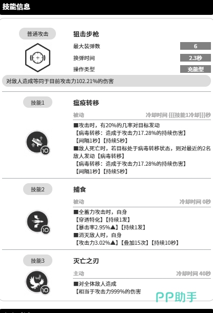 而她的被动则是有两个,第一个是瘟疫转移,输出的同时哈兰有20%的几率对敌方发起该技能,一旦发动就能给敌人造成达到17.28%输出数值的病毒持续伤害,此类病毒转移每间隔1秒就会发生一次,可持续5秒钟,若是敌人死亡时正处于病毒转移的状态,该技能则会自动转移到距离死者最近的2名敌人身上,并且病毒转移的攻击力保持不变,这使得她的伤害能够在一定程度上扩散到更多的敌人身上。