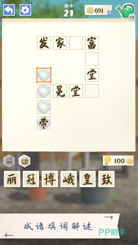都市的纸醉金迷让少女渴望在老家寻得一方宁静天地。奶奶那座承载着无数童年回忆的花园别墅,便是她此行的归处。游戏以妙趣横生的成语接龙作为核心玩法,关卡中会出现相互联系的成语链,不过成语并不完整,缺失的字会展示在关卡下方。玩家需精准填入空缺,若能依照水滴现身的顺序完成成语,就能收获珍贵水滴,用于浇灌花朵。
