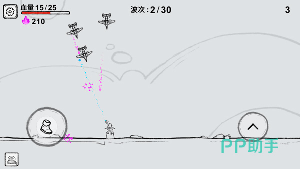 这款射击游戏比较魔性,你会成为一位魔法师,可以操控人物释放出法球对天空中盘旋的战斗机展开攻击。每当成功通关一个关卡,你便能从许多不同的特殊技能中挑选一项,你可以通过集齐多个相同的技能进行升级。游戏画面的左上角清晰显示着角色的当前血量,一旦血量被清零,玩家将遗憾地宣告关卡挑战失败。