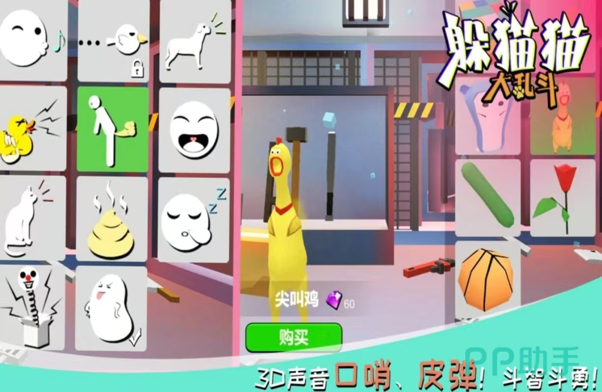 《躲猫猫大乱斗》可以多个人一起在线进行,提供了非常多不同的场地,可以和好友一起上线进行躲猫猫,每一个场地上会有很多隐藏的建筑物。可以利用他们来进行隐藏,也提供了很多道具和武器,可以快速的在地图上寻找到掩体,在比赛的时候游戏会进行倒计时,每个角色都拥有着鲜明的外观,开局之后玩家需要快速的是角色成长,在很多赛道上也会有危险面临。