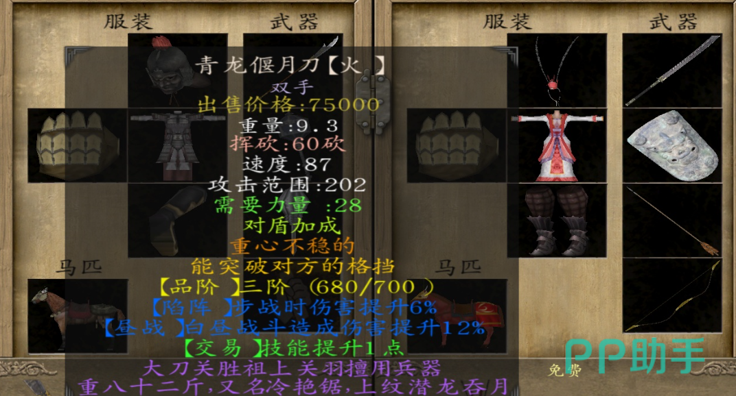 青龙偃月刀需要玩家至少有28点力量才能装备,威力在同类型武器中是独一档的存在,同时还能提供大家力量,60点挥砍等,唯一需求注意它的攻速比较慢需要靠着其他装备来相互配合。