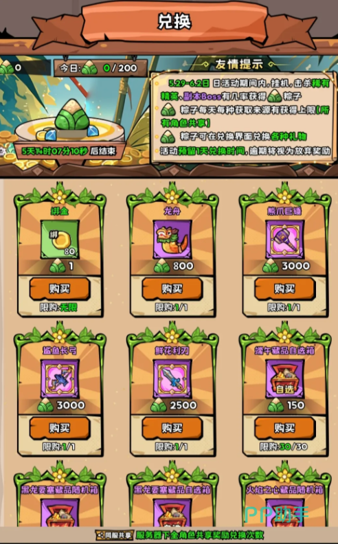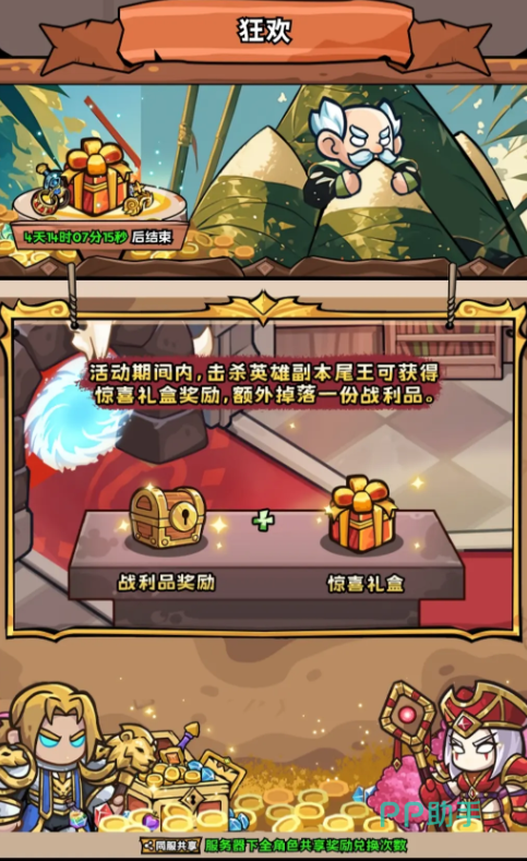 在端午期间,大家在英雄副本中击杀boss尾王,可以获得惊喜礼盒同时还会额外掉落一份战利品,通过挂机击杀其他副本boss和精英还有机会拿到道具粽子,凭借粽子可以在商店兑换各种奖励。