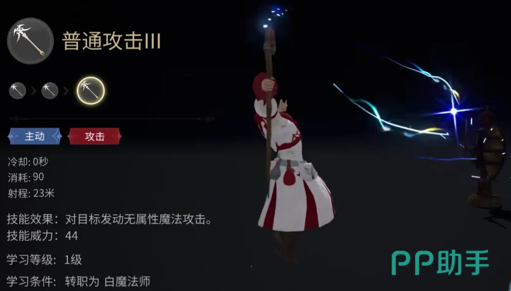 白魔法师的普攻有三段,全程都是单体威力会依次递增,玩家在没有治疗压力或其他攻击技进入冷却时,需要连续点按普攻来保持输出,她的救疗是一个单体的回复技,释放的时候还有概率给队友附加再生让其持续回血,若没有选中目标,会自动对血量最低的玩家使用。