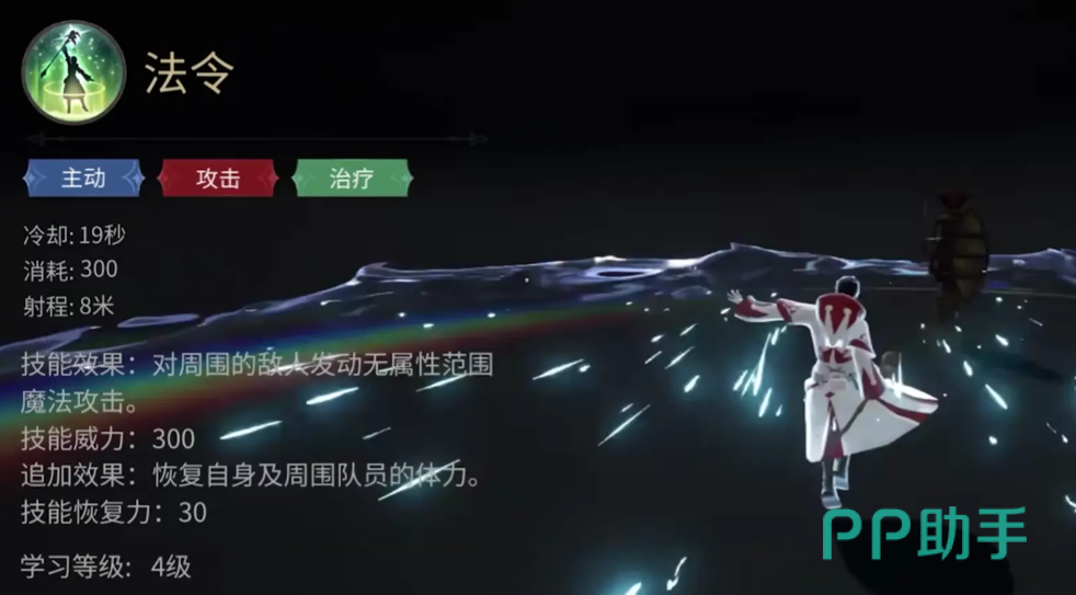 她的“全大赦”能增加自身以及周围队友受到的治疗效果,在团队血量比较危险的时候,配合其他的群疗技有不错的效果,她的“医济”是群体治疗技,能恢复自身以及周围队友的体力。