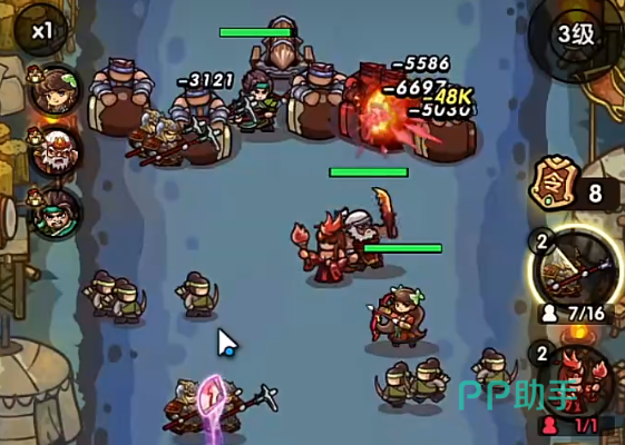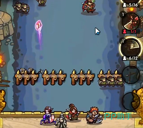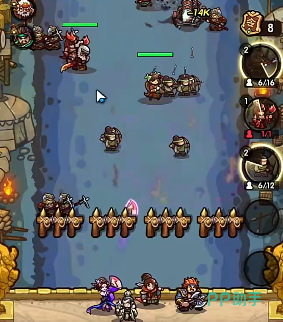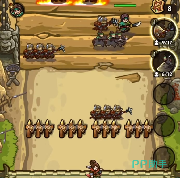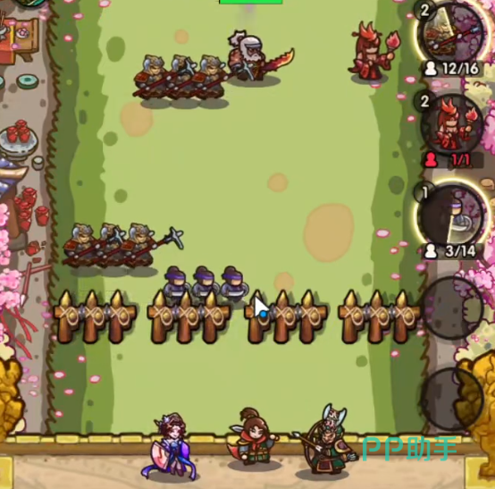 因为这些敌人都有着击退抵抗,所以这两个兵种是最为合适的。宝石技能可以携带连射,这样可以增加我们的输出。具体打法则是首先先将兵种给全部铺开。然后使用火法的牌来清理小怪。因为这关的敌人都是弱火。之后等差不多的时候可以准备弓兵来对付接下来出来的张角。如果弓兵有连射+1的话那么清理张角会简单不少。