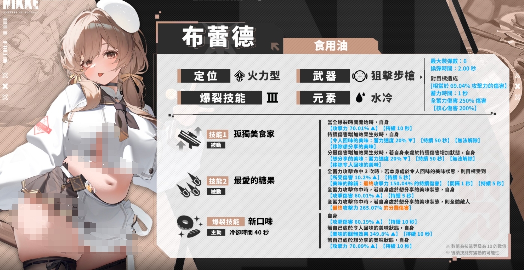 布蕾德所属的部队是颇具特色的食用油部队,与克劳斯特同队作战时,他们之间能产生一些奇妙的战术配合,而她的核心机制双重美味状态,则为她在战斗中的核心能力,技能上首先是令人回味的美味这个拥有持续伤害强化状态的效果,当全爆裂开始的时候,布蕾德自身的攻击力会得到提升,直接增加70.01%。