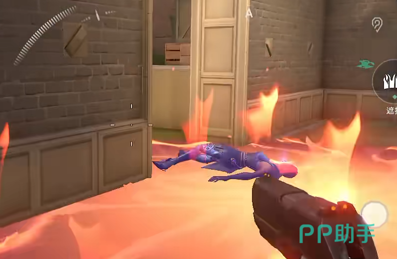 接下来说一下回防。回防A区域比较简单,玩家们在回来的时候信息刀丢在楼上的墙边。这样可以帮助我们直接能够看到完整的铁箱区域和二楼下。基本上敌人想在箱子后面阴我们是很难做到的。整体来说简单,好用。
