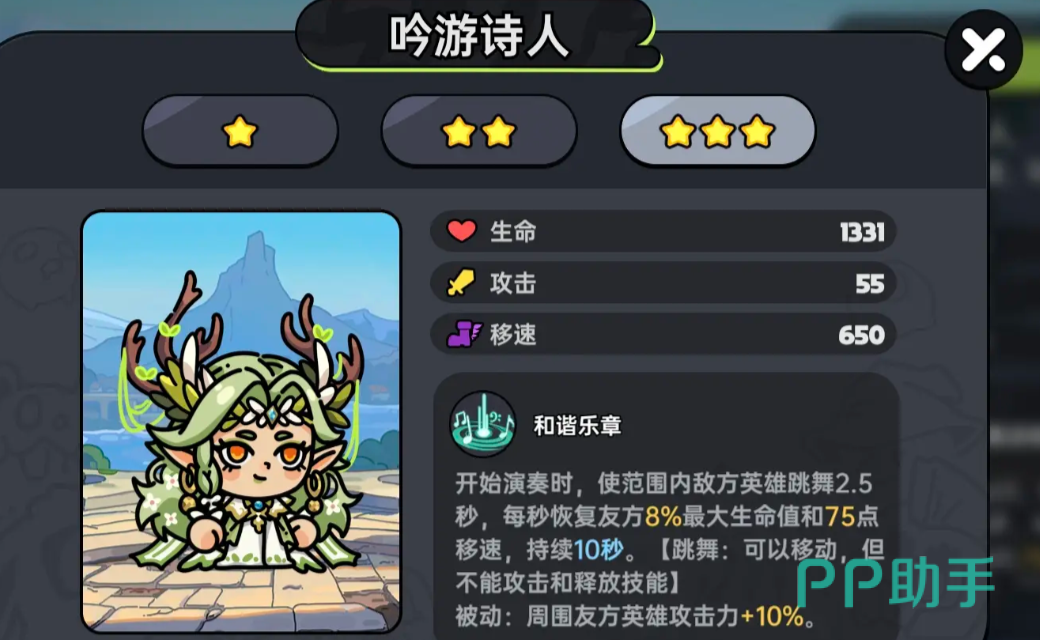 吟游诗人作为辅助有着高额回血,冷却短的同时还有攻击和移速加成,他的被动是增加周围队友10%的攻击力,主动技会开始演奏,让范围内的敌人在2.5秒内,不能进行攻击以及使用技能,但可以移动,同时在10秒内给队友进行回血,增加300群体移速。