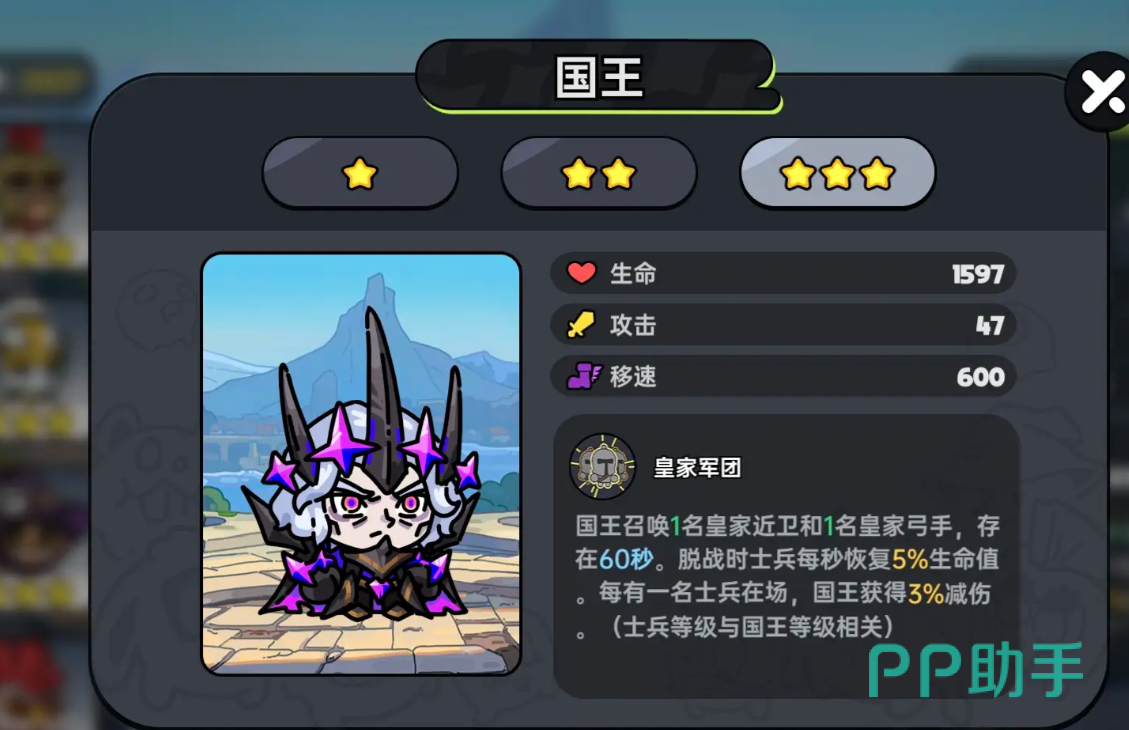国王能召唤打手提供减伤,开荒期很好用,他的主动就是召唤1名近卫和1名弓手60秒帮助进行战斗,脱离战斗他们会每秒恢复5%的血量,场上每有一位士兵,自身能得到8%的减伤。