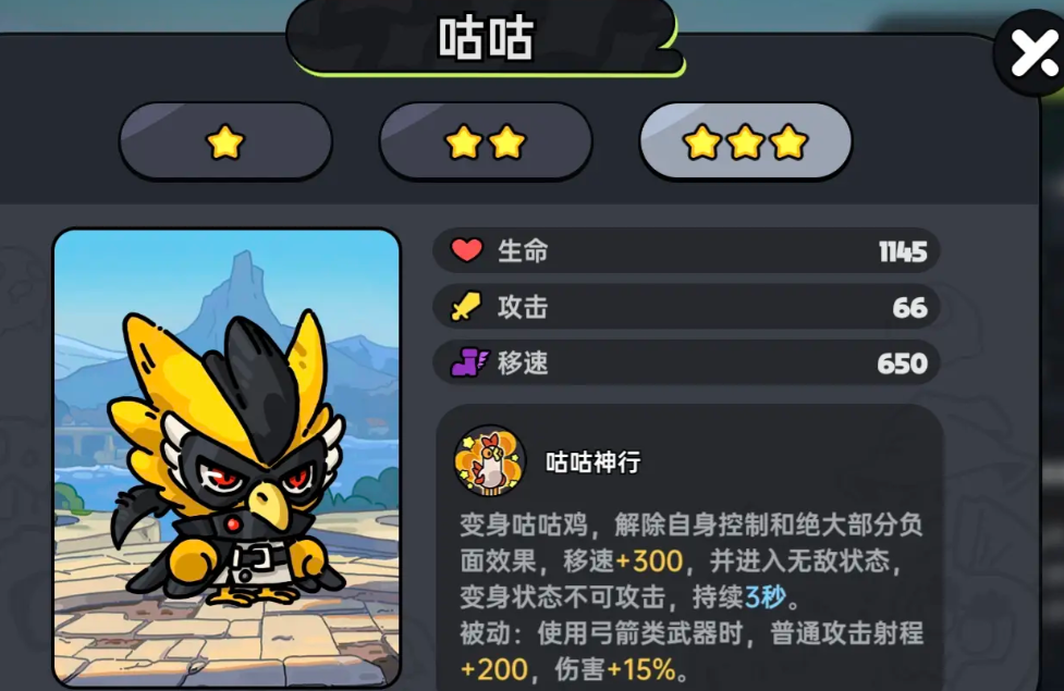 其被动是在用弓箭时,让伤害提升15%,攻击射程加200,他的主动技会变成一只鸡3秒,期间无法攻击但会解除掉自身的控制,获取400移速并进入到无敌状态中,这个角色被动增加了普攻射程和伤害,在有很多好用弓箭武器的情况下,配合上大招无敌,使得其既有伤害也有生存能力。