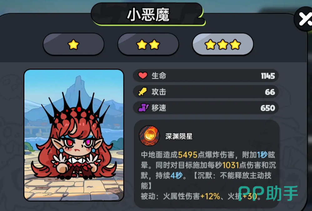小恶魔有着高额的火属性伤害,她的被动有增加火系伤害和火抗,她的主动会让陨石进行砸击造成5495伤害,并且附加上1秒钟的眩晕,同时还会叠加一个4秒的持续伤害及沉默,后者能让人不能释放主动技。