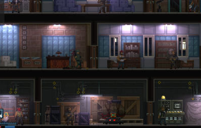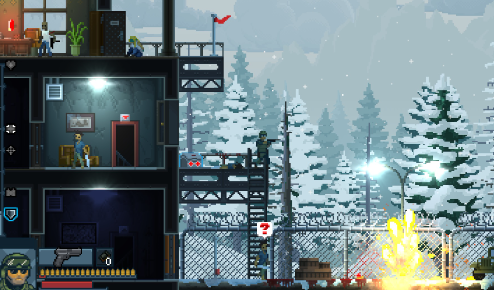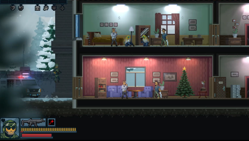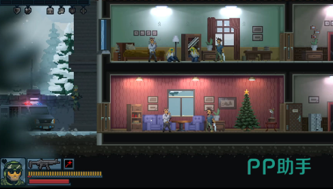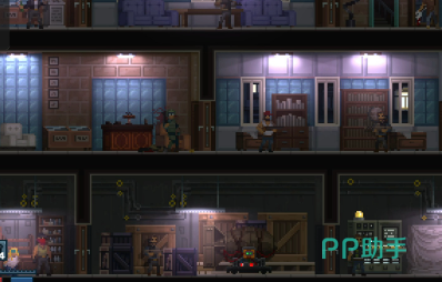 游戏采用上帝视角,玩家能清晰掌握战场全貌,战斗中合理利用掩体至关重要,箱子、铁桶、沙发等前景位置的道具都可用于掩护,玩家靠近后按蹲伏即可进入掩护状态,可以更好的躲避敌人攻击,同时游戏设有眩晕系统,破门打到、近战踢到、落地踩到敌人都能使其眩晕,可利用眩晕设定,把敌人吸引到附近,突然破门,打乱对方的节奏。