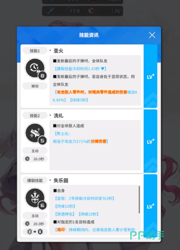 虽然桃乐丝是游戏里的一个辅助型角色,但这个角色依旧是ssr级别,在战斗过程中会使用突击步枪进行攻击,除了常规的设计之外,角色还是有三个技能,首先一技能名叫圣火,这是一个被动技能,这个技能主要作用在队友身上,除了可以让其他的成员减少大招的冷却时间之外,在大招触发之后,对于对手的零件伤害也能提升50%。