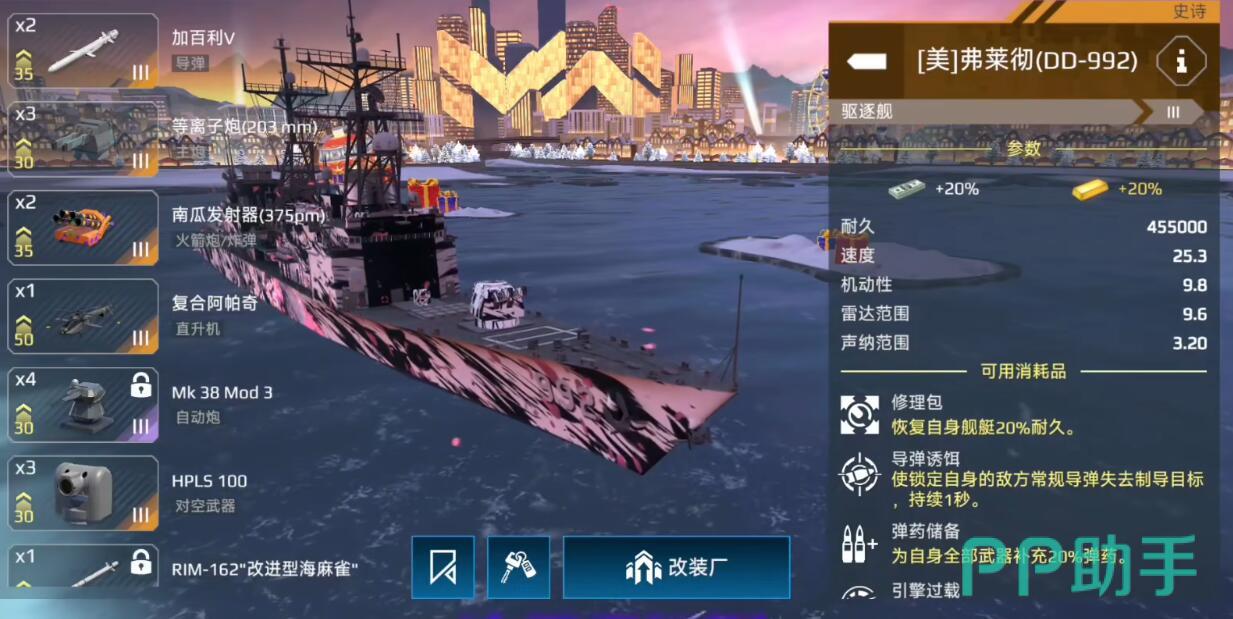 Smart8000是当前版本最超模的驱逐舰,30节极速+高机动性使其成为战场“幽灵杀手”。该舰锁定导弹“提尔峰”突防能力极强,配合灰鲭鲨鱼雷可瞬间打出30万+爆发伤害。而且Smart8000还能携带两架武直增强反潜或对舰输出,防空性能同样优秀,适合担任侧翼突袭或快速转场支援的角色,高端局表现非常不错。