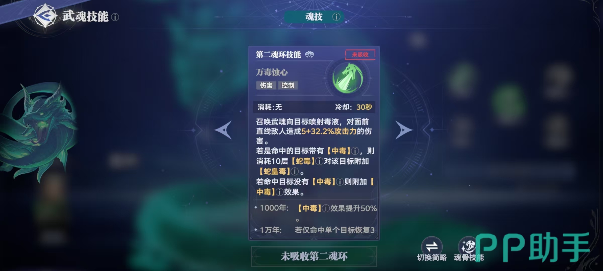 在最为关键的奥义技能方面,碧磷蛇皇的技能效果是直接释放剧毒领域,这个领域持续10秒钟,通过消耗蛇毒来对范围敌人造成高额伤害。魂技的效果是召唤武魂向目标喷射毒液,对面前的直线敌人造成伤害,如果命中的目标带有中毒,则将消耗10层蛇毒,对目标附加蛇皇毒。没有中毒的目标会受到中毒效果。结合这些技能效果,大家不难看出,碧磷蛇皇在输出方面并没有太高的爆发,它就是依赖自身的各个技能机制来实现中毒叠加。同时还具有一定的控制效果,但控制也并不属于硬控。