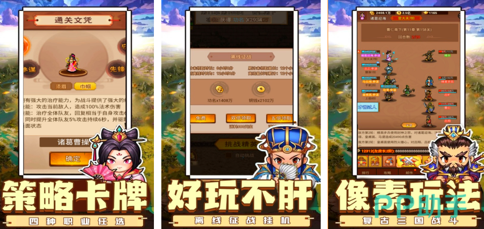 像素风格搞怪无厘头的历史类小游戏,作为以三国群雄争霸为背景,玩家可选择成为不同势力的主公,发展城池势力、招募强力武将,带领军队不断征战扩大势力范围。游戏中的随机事件很多,台词对话充满搞怪欢乐元素。对战采用回合制卡牌对抗模式,可自动挂机战斗,好玩休闲又不耗费太多精力。